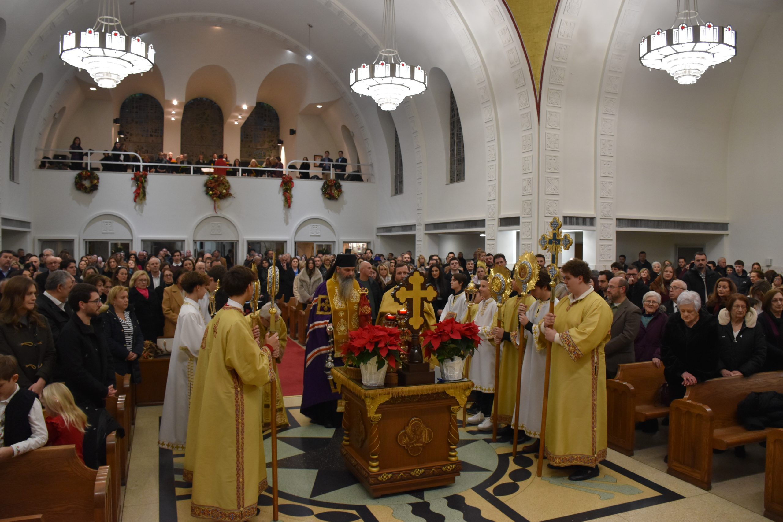 Радост овог празника увеличао је Његово Преосвештенство Епископ Костајнички Серафим, викар Његовог Високопреосвештенства Архиепископа новограчаничко-чикашког и Митрополита средњезападноамеричког Лонгина. Епископ Серафим је служио Свету Архијерејску Литургију на Бадњи дан уз саслужење протојереја-ставрофора Михаила Волзханског из Руске Заграничне Цркве, протојереја-ставрофора Звонка Костића из Цркве Светог Стефана Дечанског, протонамесника Александар Вујковића старешине Саборног Храма и протојереја-ставрофора Живана Урошева у пензији. Владика Серафим је по завршетку Свете Литургије поздравио верни народ говорећи о значају овог великог празника и неизмерне љубави Бога ка човеку.