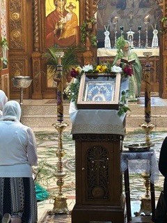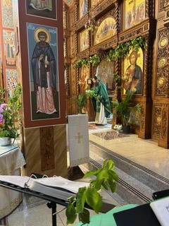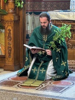 On Sunday 8 June 2025, on Pentecost-Holy Spirit Day-Trojčindan, Archimandrite Sergije and Hieromonk Makarije (Robinett) served Divine Liturgy, followed by the three Pentecost kneeling prayers, during which those present weaved wreathes and crosses from the fresh greenery, which also decorated the Monastery Church iconostasis. The Rt. Rev. Sava (Juric), retired Bishop of Slavonia, was prayerfully present and partook of Holy Communion, as did Protosindjel Filotej, who, along with Fr. Sergije and Fr. Markarije, each read one of the kneeling prayers. Responses were sung on both days by the Archiepiscopal Choir. Among the pilgrims to the Monastery on this great Feast day were Dr. Srdja Trifkovic, his wife Mira and James Jatras, former diplomat, policy advisor and Senate leadership analyst.
