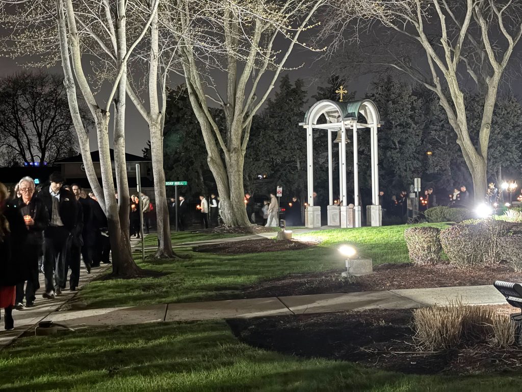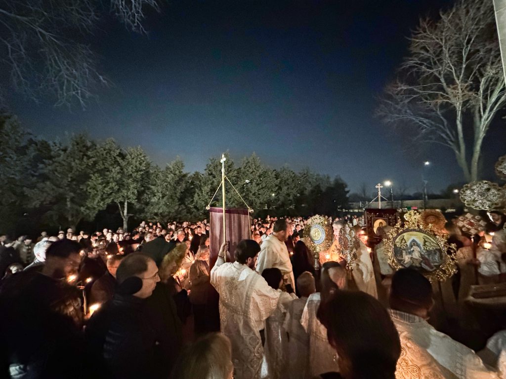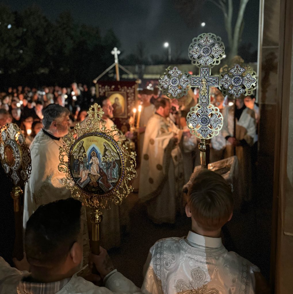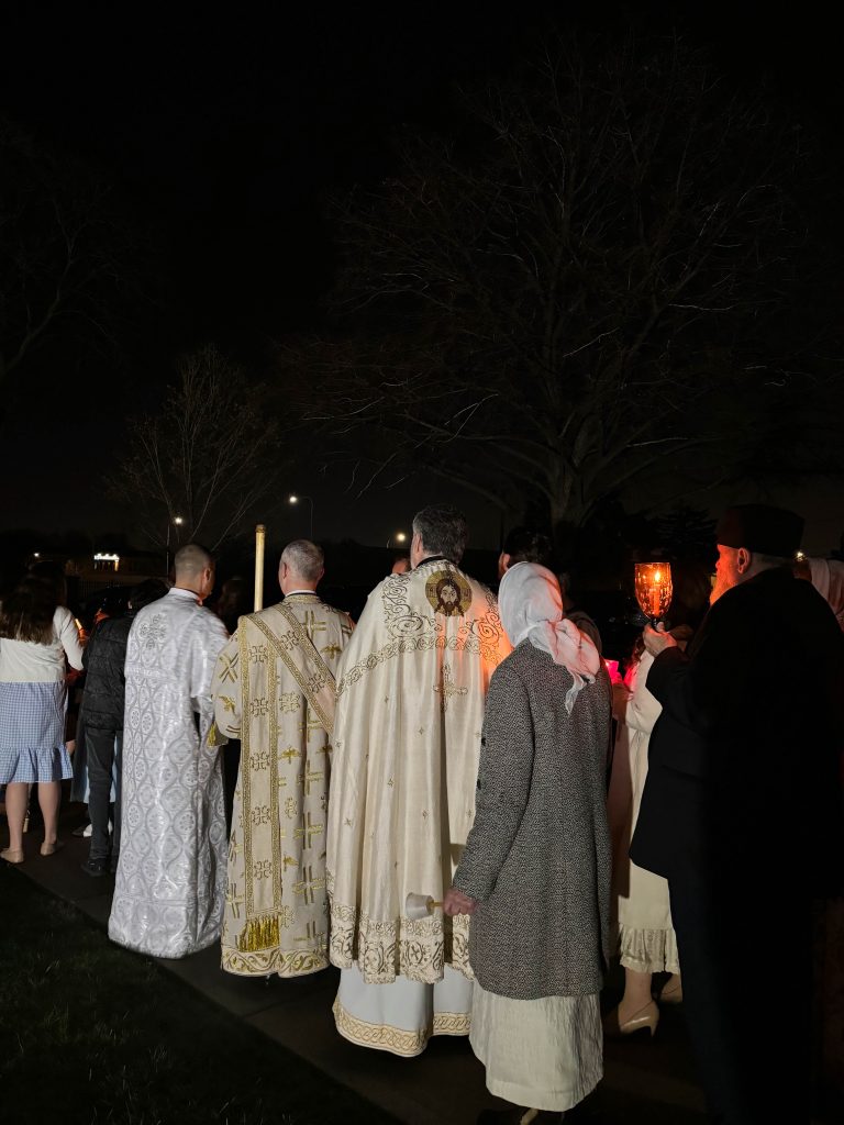 The service began in solemn anticipation with a candlelit procession led by the clergy, joined by the faithful as they circled the church three times in remembrance of the Myrrh-bearing women’s journey to the tomb. At the conclusion of the procession, we gathered before the closed doors of the Cathedral. It was there, in the stillness of the night, that the glorious proclamation of Christ’s victory over death resounded: “Let God arise, and let His enemies be scattered!”